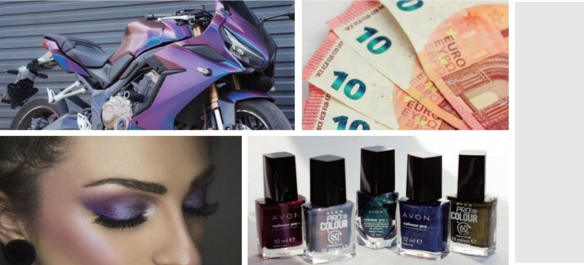 Optical Variable Pigments, based on the principles of physical optics,offer captivating visual effects while being environmental-friendly, safe,and resistant to fading. Sunrise’s High-Brightness Solid Colour Series combines exceptional brightness with superior coverage, delivering striking and vivid colours. The Transparent Colour Series achieves high brightness alongside excellent transparency. Both series exhibit a strong colour-shifting effect depending on the viewing angle and feature a distinctive metallic sparkle.They cover the entire colour range-including red, orange, yellow, green, cyan, blue, purple, gold, silver and more, offering over 30 colours. These pigments are suitable for various applications, including anti-counterfeit printing, cosmetics, automotive customisation, leather shoes and other industries.